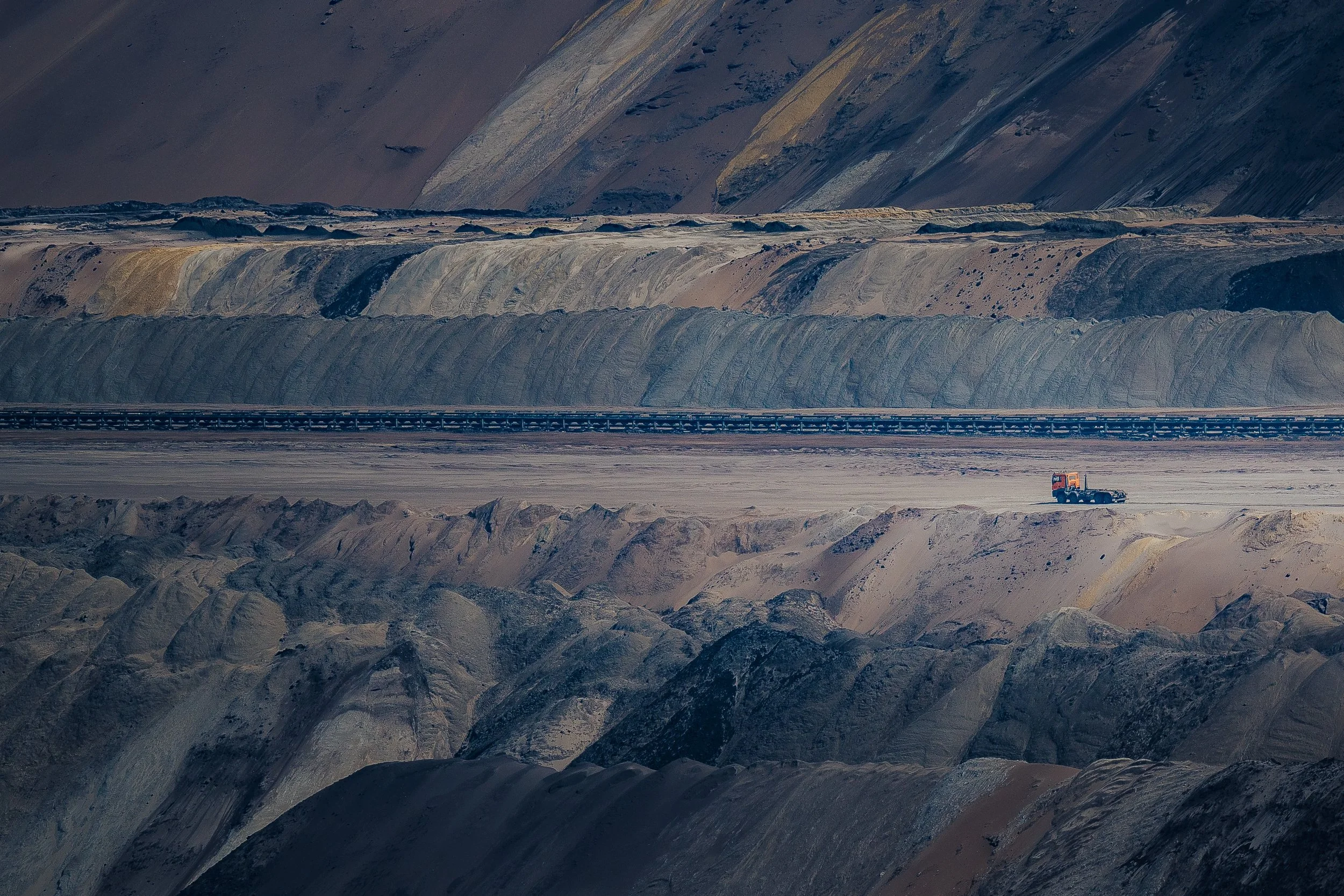 A truck in a almost desert like landscape inside of the Garzweiler coalmine